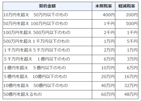 税額は契約金額ごとに定められており、令和9年3月31日までは軽減措置が適用されています。